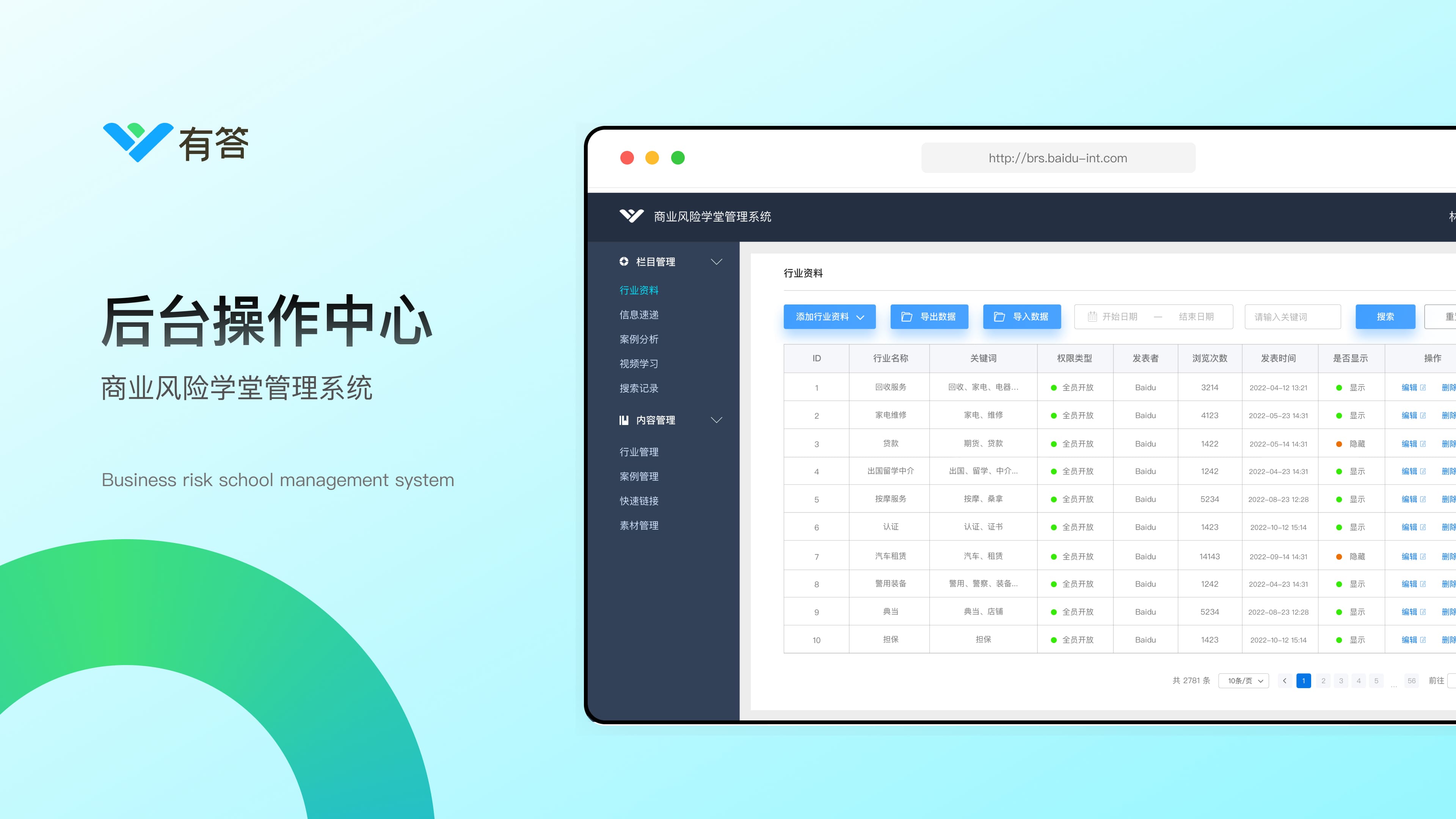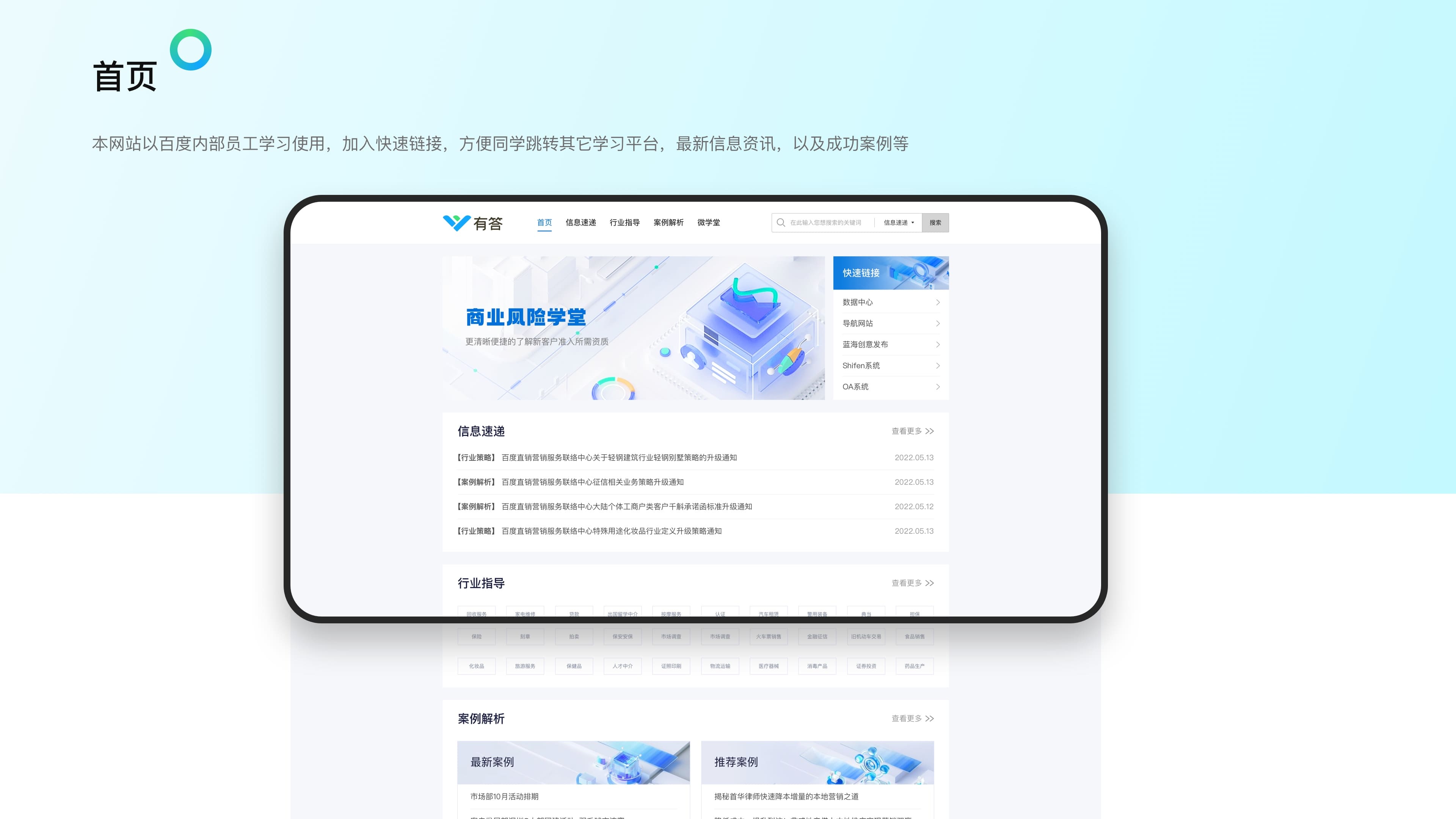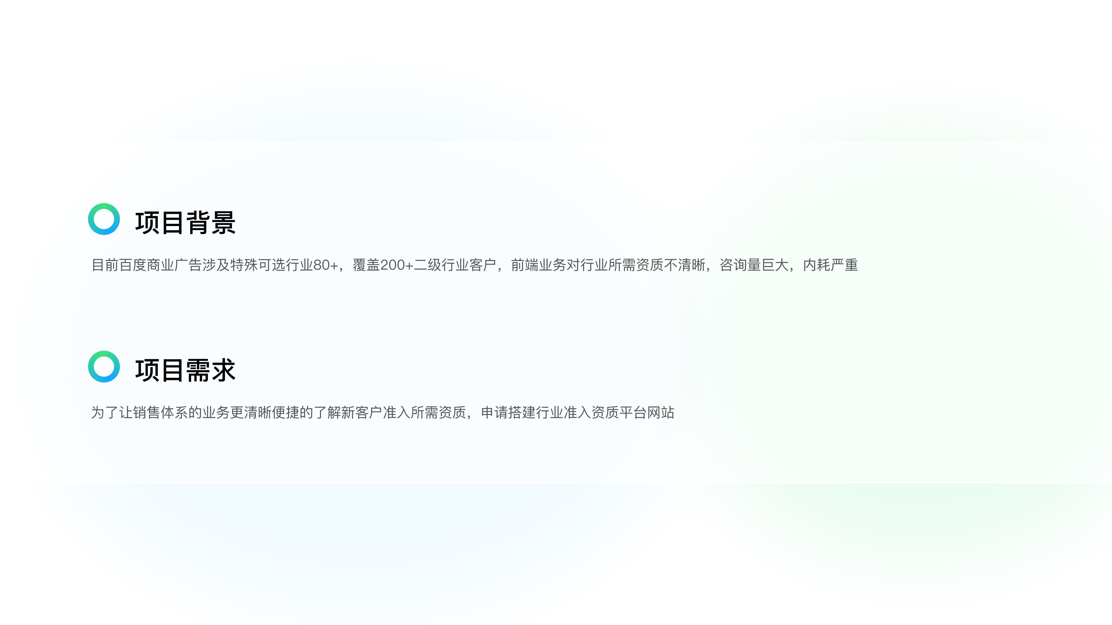 目前百度商业广告涉及特殊可选行业80+,覆盖200+二级行业客户,前端业务对行业所需资质不清晰,咨询量巨大,内耗严重。